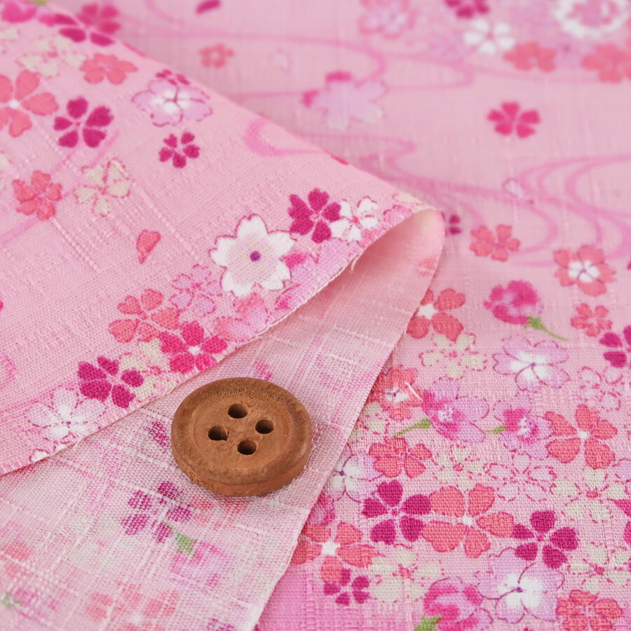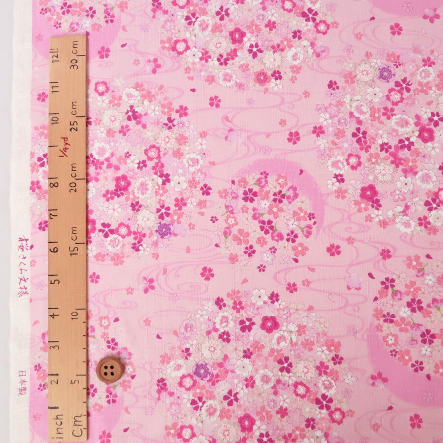和柄コットン生地 流水に月の花かご(ピンク)浴衣・甚平向き■綿100% ■約110cm幅 ■厚み約0.43mm生地の上のボタンは直径約2cmです。