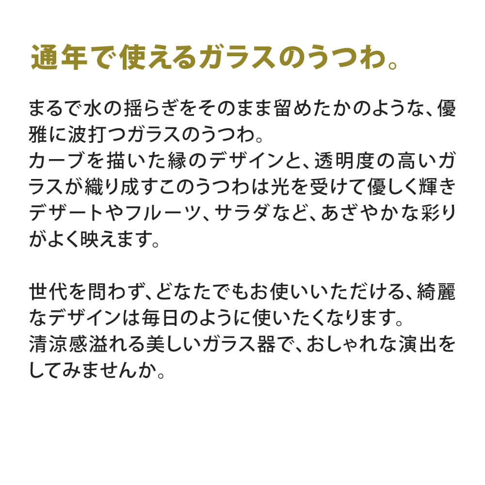 大きく波打つようにカーブを描いた縁のデザインと、透明度の高いガラスが織り成すこのうつわは光を受けて優しく輝き、デザートやフルーツ、サラダなど、あざやかな彩りがよく映えます。