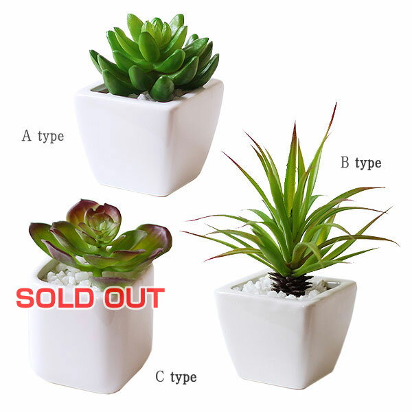 3タイプのフェイクの多肉植物がそれぞれ陶器性のプランターに埋められています。